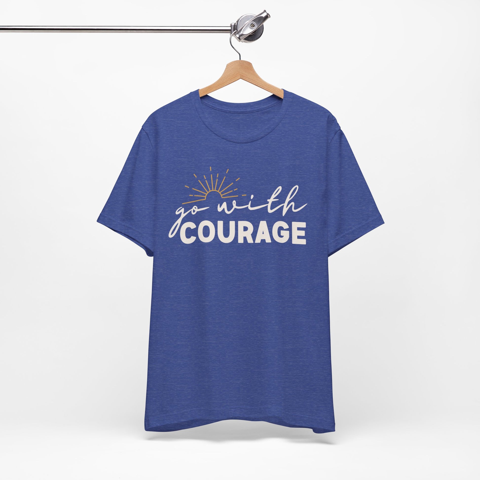 Printed on the premium Bella + Canvas 3001, this tee is light, smooth, and made for everyday movement. A subtle sunrise graphic and the words “Go with Courage” sit on the front, with the Kurij logo printed on the back for a clean, refined finish.